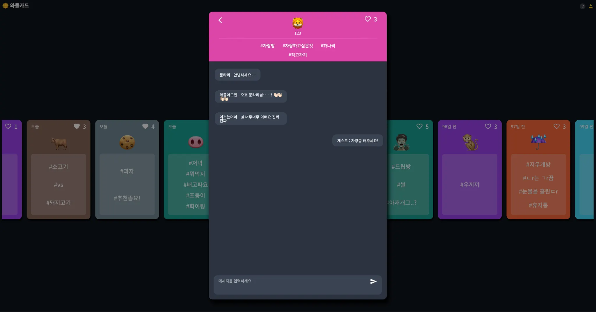 홈 화면에 유저들이 만든 카드가 띄워지고, 채팅방에 참여하고 싶은 유저들은 카드를 클릭하여 대화에 참여합니다.