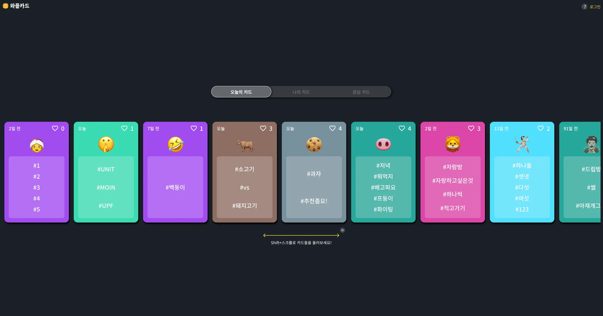 다양한 관심사를 말하면서 재미요소가 있다고 기대합니다. (이런 익명성과 자유주제 컨셉방이라는 성질과 해쉬태그와 카드라는 컨셉)
