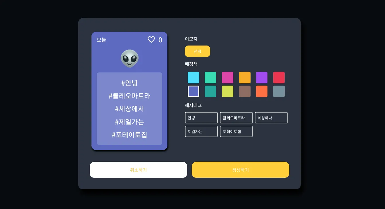 자신이 대화하고 싶은 키워드를 해시태그로 작성하고 이모지, 카드컬러를 선택하여 나만의 와플카드를 생성합니다.